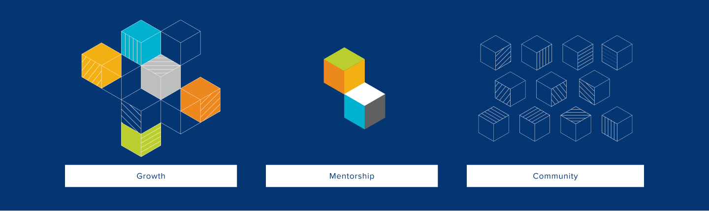 The direction and goal was to encapsulate the brand around the values seen below — Growth, Mentorship, and Community. I provided the idea that we build around a 3-dimensional isometric square, allowing us to vary individual square shapes through color and line-work, while being able to take advantage of easily modified visual structures. We were able to explore and utilize the unique pattern to intertwine the CSAP’s identity into something colorful, lively, and focused on the educational aspect of the brand.